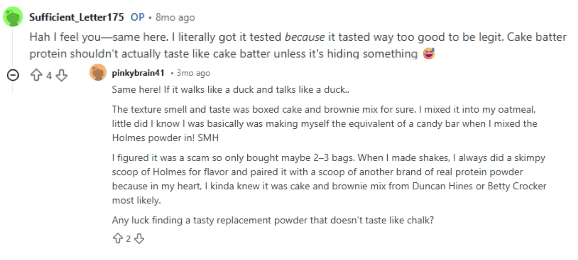 Holmes Nutrition sold exclusively through their website at $75 per bag, marketing the product’s sweet taste and suitability for baking. The company positioned itself as a premium option, with many customers praising its taste and noting it resembled cake batter. This distinctive flavor profile ultimately raised suspicions that led to the independent testing.