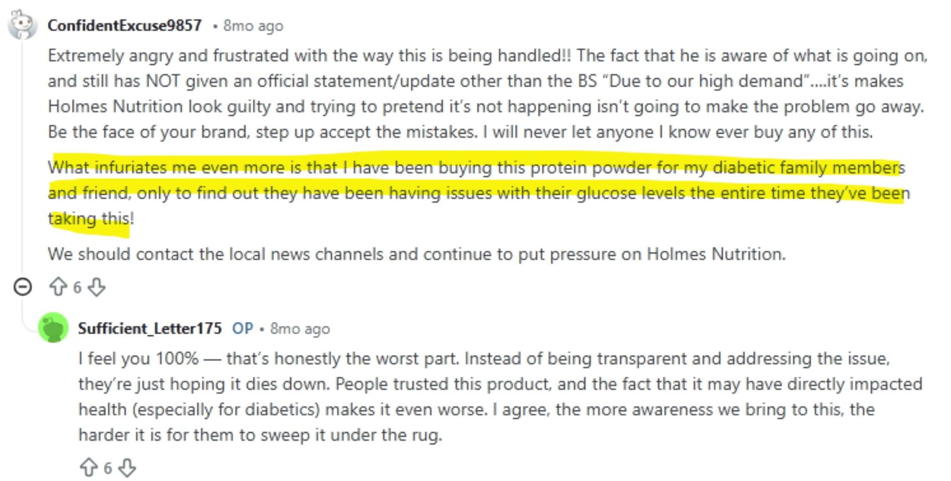 Following the March 2025 Reddit post revealing the lab results, Holmes Nutrition removed all protein powder products from their online store. The company posted messages on their website citing “unexpected issues with the manufacturing facility” and “large increase in demand” as reasons for the removal. They claimed to be searching for a new manufacturer capable of handling their growth, stating this would be their fourth manufacturing partner.