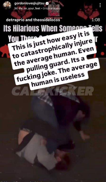 The champion added his own commentary overlaid on the clip: This is just how easy it is to catastrophically injure the average human. Even pulling guard. Its a f**king joke. The average human is useless.”