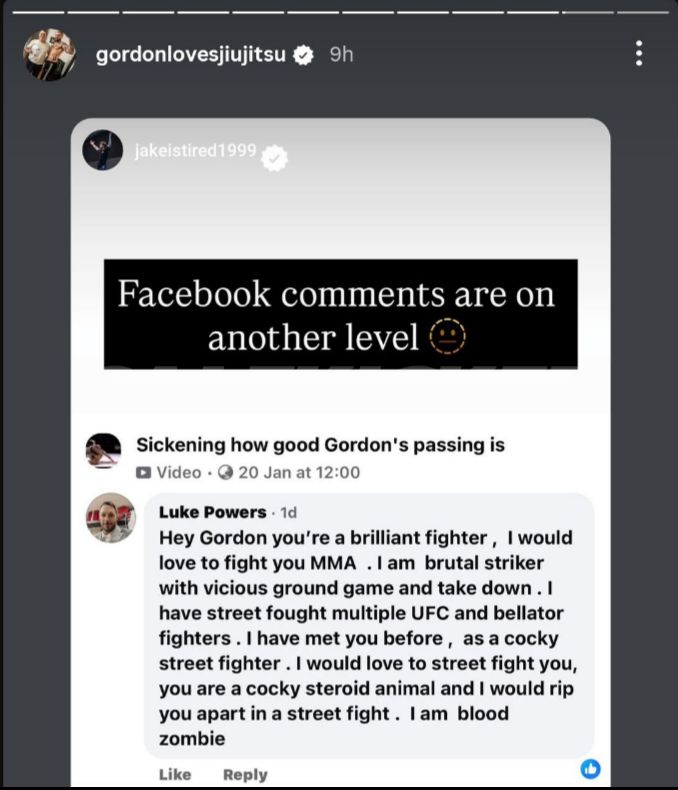 Brazilian Jiu-Jitsu champion Gordon Ryan recently took to social media to share his amusement at an unusual challenge he received through Facebook comments.