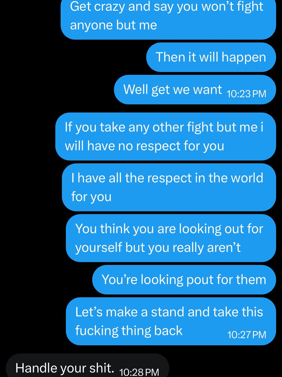 In the leaked messages, Iaquinta proposed a united front. “They need us to headline this card. I want 150 and 50 to fight you. That’s not unreasonable,” he wrote.