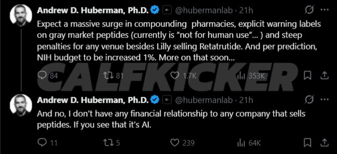 Huberman forecasts significant shifts on the horizon. He anticipates “a massive surge in compounding pharmacies, explicit warning labels on gray market peptides (currently is ‘not for human use’…) and steep penalties for any venue besides Lilly selling Retatrutide.” He also predicts the NIH budget will increase by 1%, with more details to come.