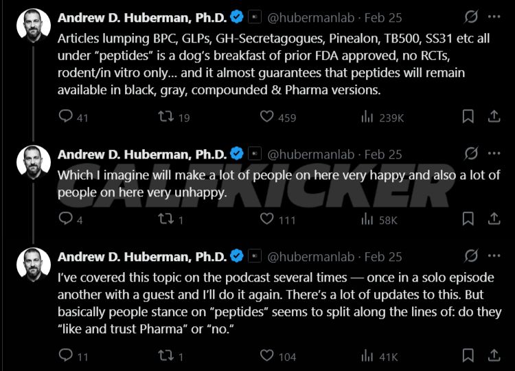 In a series of posts on social media, Huberman criticized how journalists and outlets group together peptides like BPC-157, GLP-1 agonists, growth hormone secretagogues, Pinealon, TB-500, and SS-31 under a single umbrella term.