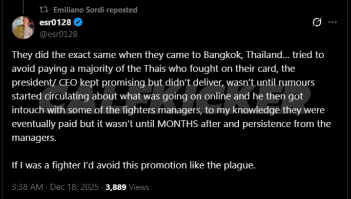 Sordi framed his complaint as extending beyond his individual situation. “This isn’t just about me. Fighters deserve respect, professionalism, and to be paid on time,” he wrote. “Honoring contracts is not optional.”
