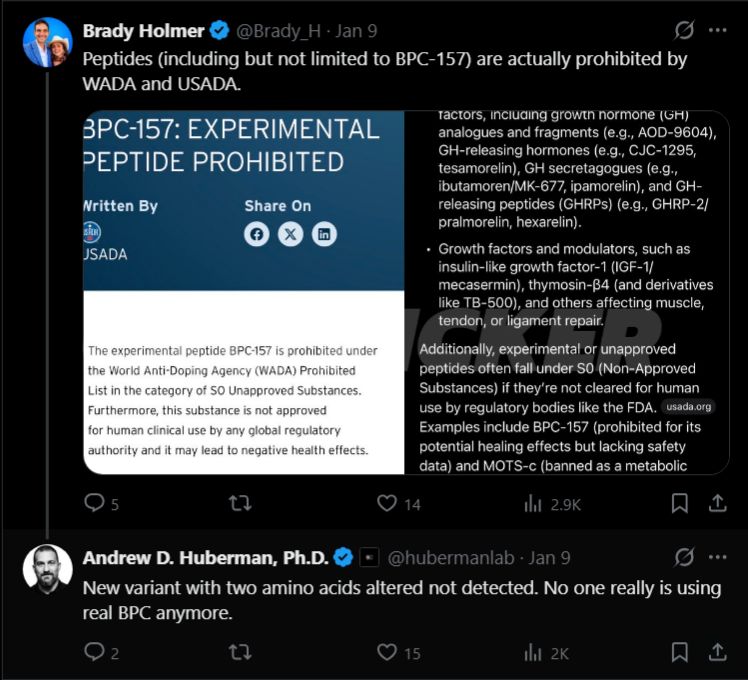 However, when another user pointed out that peptides including BPC-157 are actually prohibited by both WADA and USADA, Huberman revealed something even more concerning: “New variant with two amino acids altered not detected. No one really is using real BPC anymore.”
