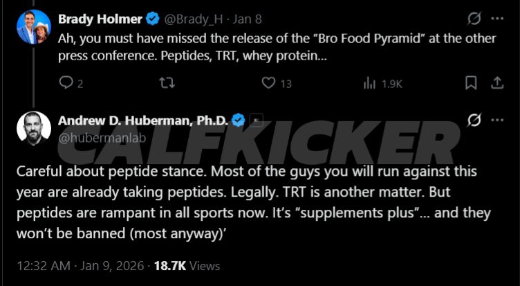 When responding to a discussion about competitive athletics on Twitter, Huberman issued a striking warning: “Most of the guys you will run against this year are already taking peptides. Legally. TRT is another matter. But peptides are rampant in all sports now. It’s ‘supplements plus’… and they won’t be banned (most anyway).”
