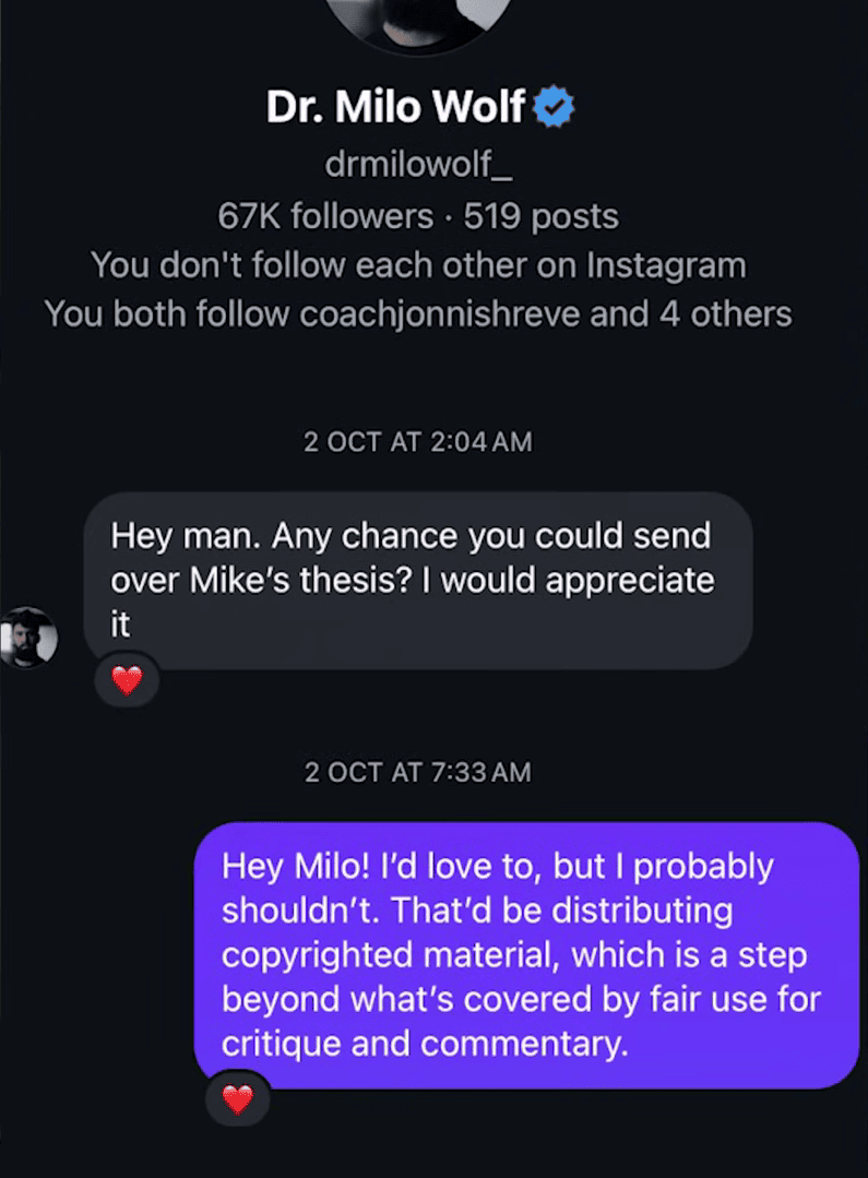 On September 30, 2025, Solomon Nelson released his critique of Mike Israetel’s doctoral thesis. Two days later, Milo Wolf sent Nelson a direct message requesting Mike’s thesis.