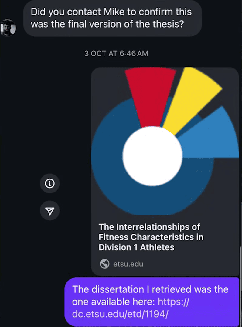 When Nelson declined, citing copyright concerns, Milo asked whether Nelson had confirmed with Mike that he was reviewing the final version. Nelson replied that he had retrieved the dissertation from the official East Tennessee State University repository.