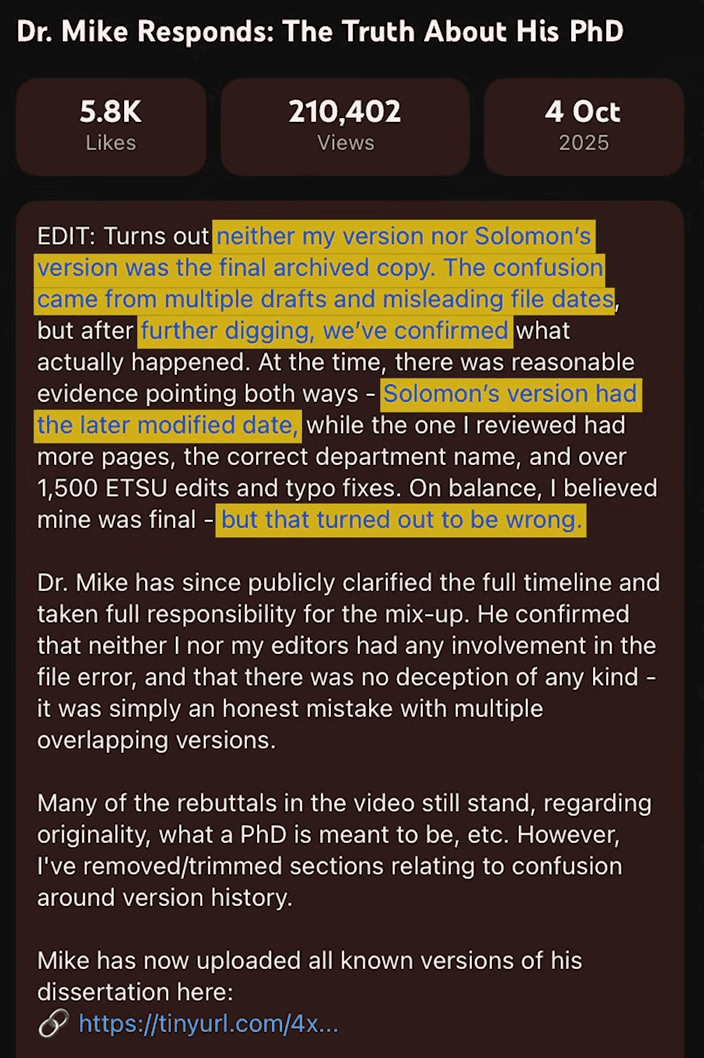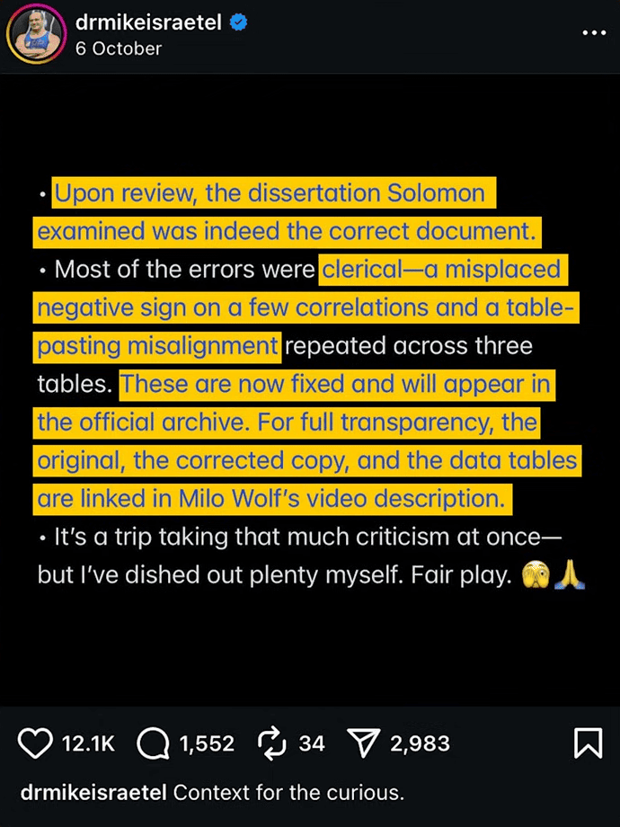 However, the defense collapsed entirely on October 6, 2025. Mike Israetel posted a public statement confirming that Nelson had indeed reviewed the correct document. “Upon review, the dissertation Solomon examined was indeed the correct document,” Mike wrote, completely retracting the wrong version narrative.