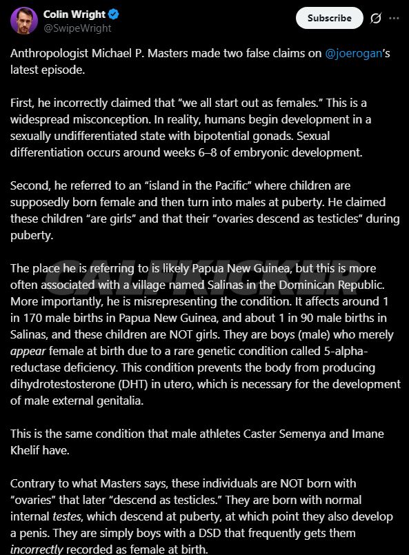 Colin Wright, an evolutionary biologist, took to social media to address what he described as two major factual errors in Masters‘ discussion with podcast host Joe Rogan. The corrections center on fundamental aspects of human embryonic development and a rare medical condition affecting children in certain isolated populations.