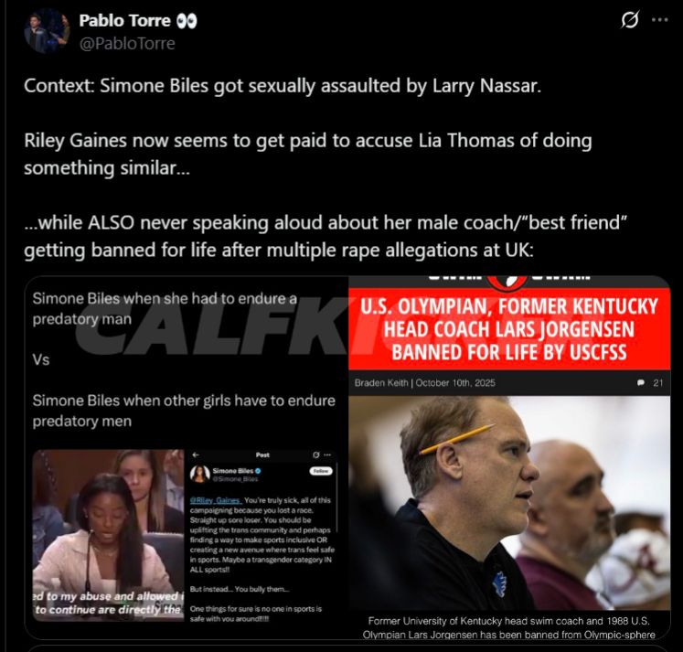 Torre contrasted her silence about documented harm with her increasingly forceful statements about Thomas. Gaines once expressed empathy for Thomas’s transition, but later said sharing a locker room with Thomas amounted to “s**ual assault” and “voyeurism.”