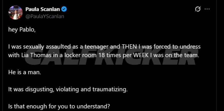 “I was s**ually assaulted as a teenager and THEN I was forced to undress with Lia Thomas in a locker room 18 times per WEEK I was on the team. He is a man. It was disgusting, violating and traumatizing. Is that enough for you to understand?”