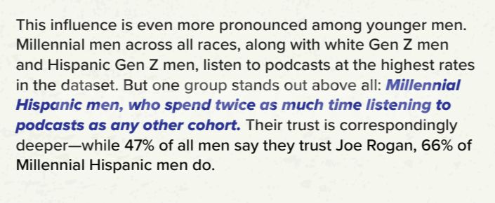 Six in ten men listen to podcasts weekly. Twelve percent spend six hours or more on long-form audio. Many of these creators hold more influence in daily life than journalists or public officials because men hear from them more consistently and for longer periods of time.