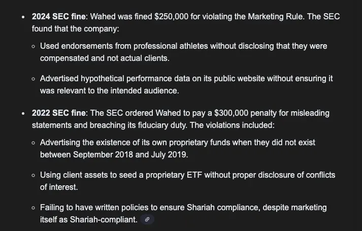 Wahed’s track record with the U.S. Securities and Exchange Commission paints a concerning picture. In 2024, the company was slapped with a $250,000 fine for violating marketing regulations.