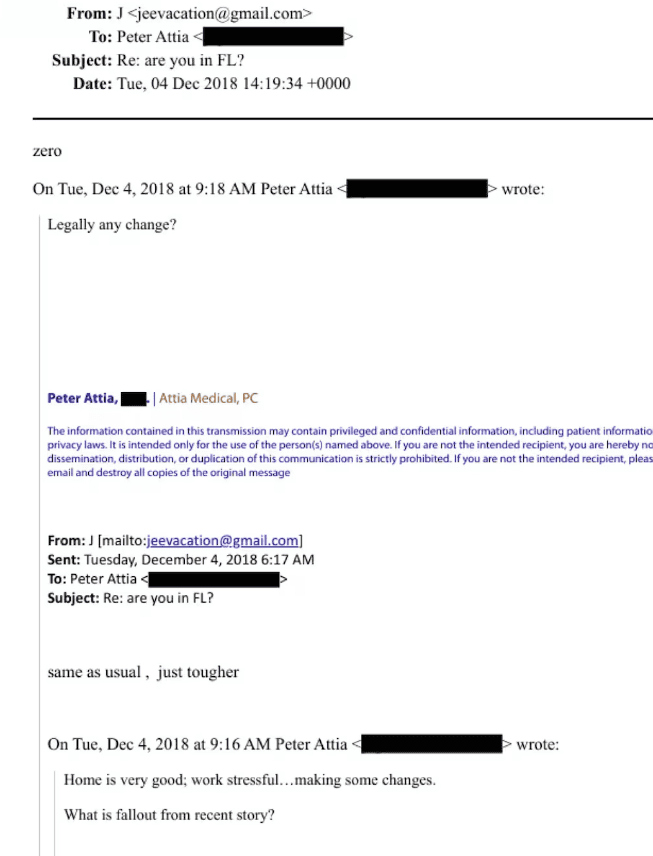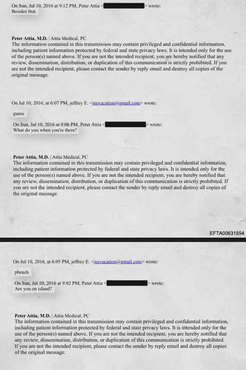 On December 4, 2018, he messaged Epstein asking, “What is fallout from recent story?” When Epstein responded that it was “Same as usual, just tougher,” Attia asked if there was any legal change.