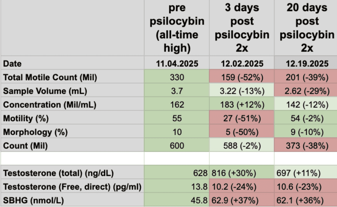 The headline finding was straight: “Two doses of magic mushrooms degraded my sp**m count from the 99.6th percentile to the 77.7th.”