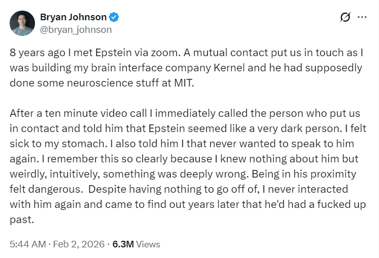 “A mutual contact put us in touch as I was building my brain interface company Kernel and he had supposedly done some neuroscience stuff at MIT,” Johnson wrote. “After a ten minute video call I immediately called the person who put us in contact and told him that Epstein seemed like a very dark person. I felt sick to my stomach.”