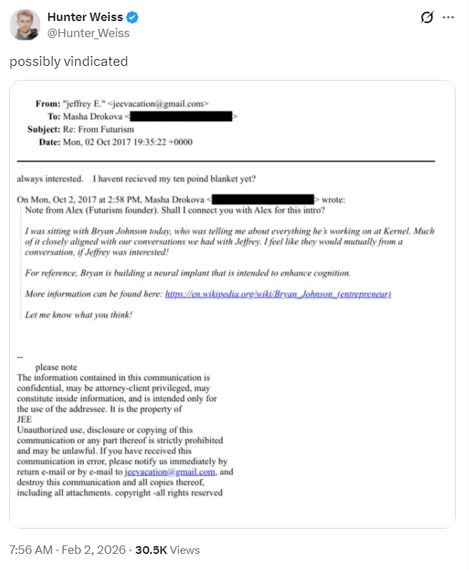 Johnson is known for his controversial “Project Blueprint” anti-aging protocol and his previous work as the founder of brain interface company Kernel. He took to social media to address his appearance in the newly released documents.