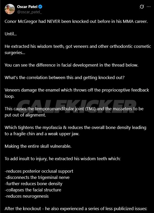 “Veneers have been the hidden downfall of many athletes as they contribute to weakening the skull and leading to a biomechanical collapse,” Patel claimed, citing fighters Conor McGregor and footballer Kevin De Bruyne as examples.