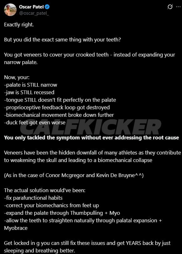 “You got veneers to cover your crooked teeth – instead of expanding your narrow palate,” Patel wrote in a detailed thread. “Now, your palate is STILL narrow, jaw is STILL recessed, tongue STILL doesn’t fit perfectly on the palate.”