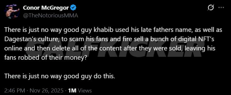 “There is just no way good guy khabib used his late fathers name, as well as Dagestan’s culture, to scam his fans and fire sell a bunch of digital NFT’s online and then delete all of the content after they were sold, leaving his fans robbed of their money?”