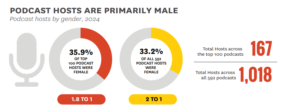 A November 2025 report from the USC Annenberg Inclusion Initiative analyzed gender and racial representation among hosts across 592 of the top Spotify podcasts from 2024, along with guest appearances on the top 100 shows.