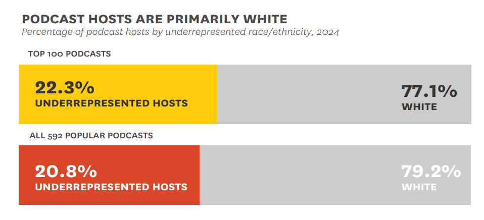 That figure sits well below the 41.6% of Americans who identify as non-white. Women of color face the steepest barriers, holding just 6.6% of top 100 podcast host slots, the lowest representation of any group across podcasting, film, television, or music in 2024. A