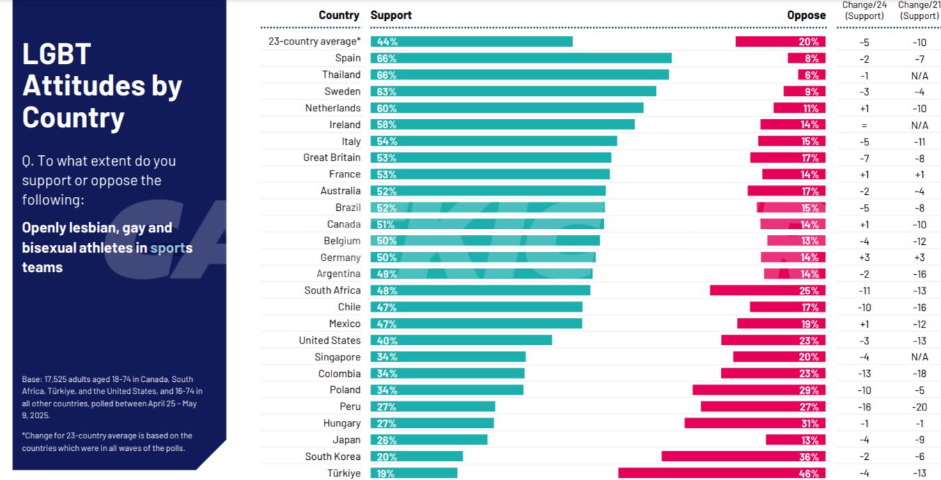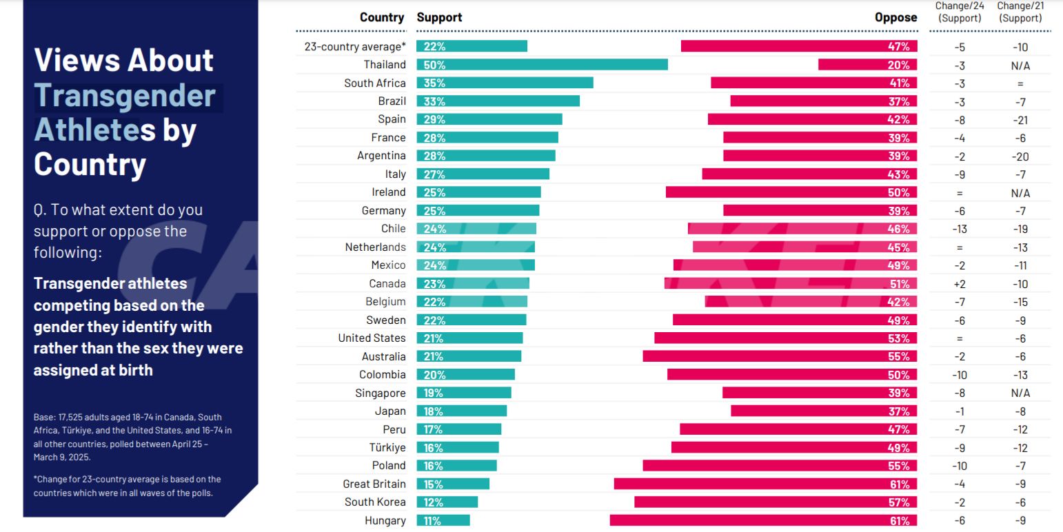 The 2025 Ipsos LGBT+ Pride Report, which surveyed more than 17,000 adults across 26 countries, found that only 22% of respondents now support transgender athletes competing based on the gender they identify with rather than their biological sex. This is a significant drop of 10 percentage points since 2021 and a five-point decline from just last year.