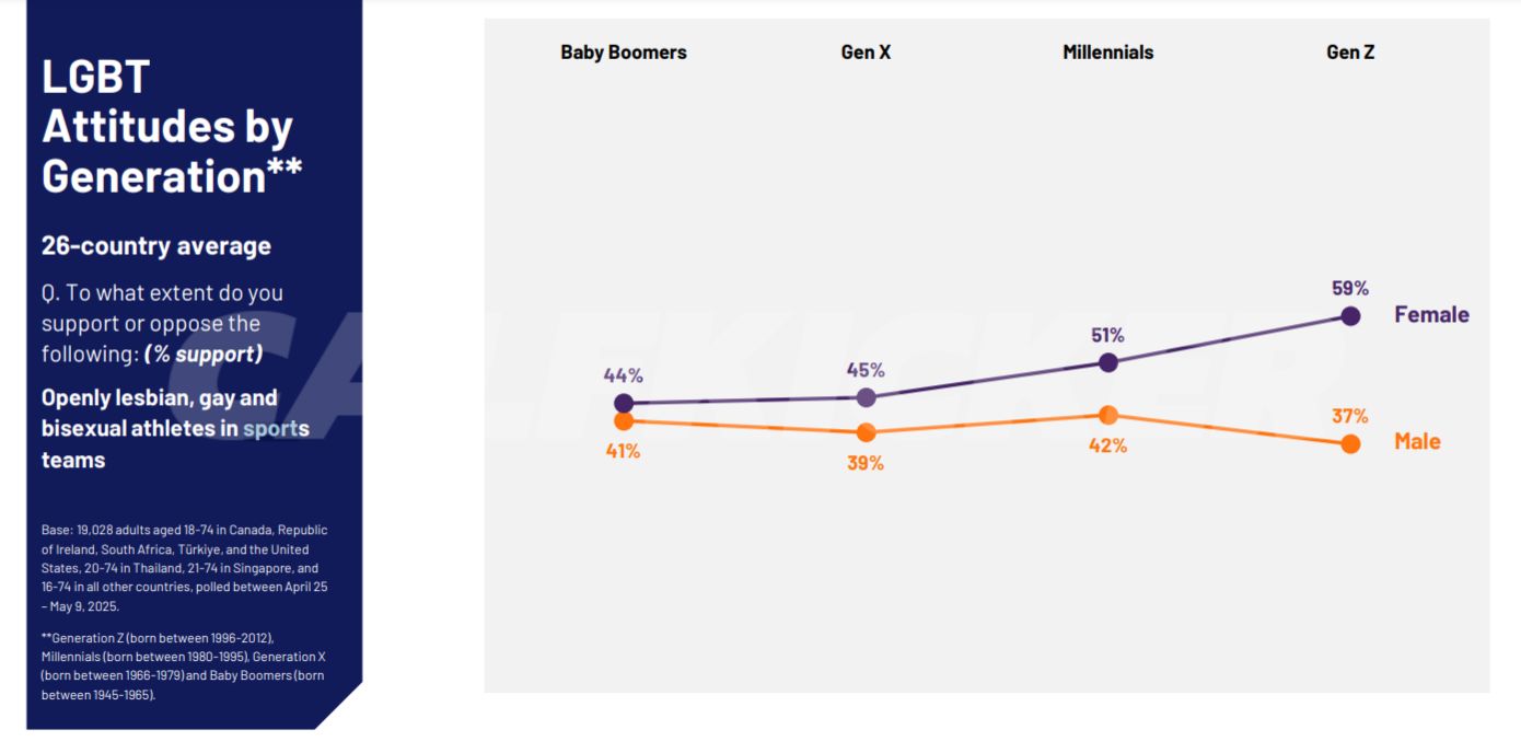 The data also revealed unexpected generational patterns that challenge assumptions about younger people uniformly holding more progressive views. While Generation Z women showed the highest support for openly lesbian, gay and bisexual athletes in sports at 59%, Generation Z men recorded the lowest support of any demographic group at just 37%—creating a striking 22-percentage-point gender gap within the youngest generation.