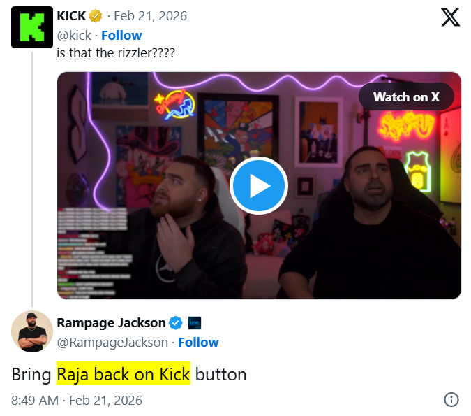 “Bring Raja back on Kick button,” Jackson wrote on X in response to one of the platform’s recent posts. The comment has already garnered over 500 likes.