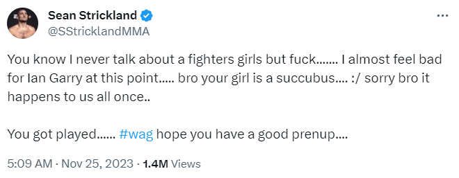 He wrote: “You know I never talk about a fighters girls but f*ck……. I almost feel bad for Ian Garry at this point….. bro your girl is a succubus…. :/ sorry bro it happens to us all once.. You got played…… #wag hope you have a good prenup….”