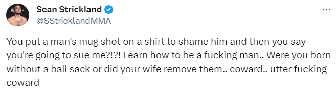 “You put a man’s mug shot on a shirt to shame him and then you say you’re going to sue me?!?! Learn how to be a f*cking man.. Were you born without a b*ll sack or did your wife remove them.. coward.. utter f*cking coward”