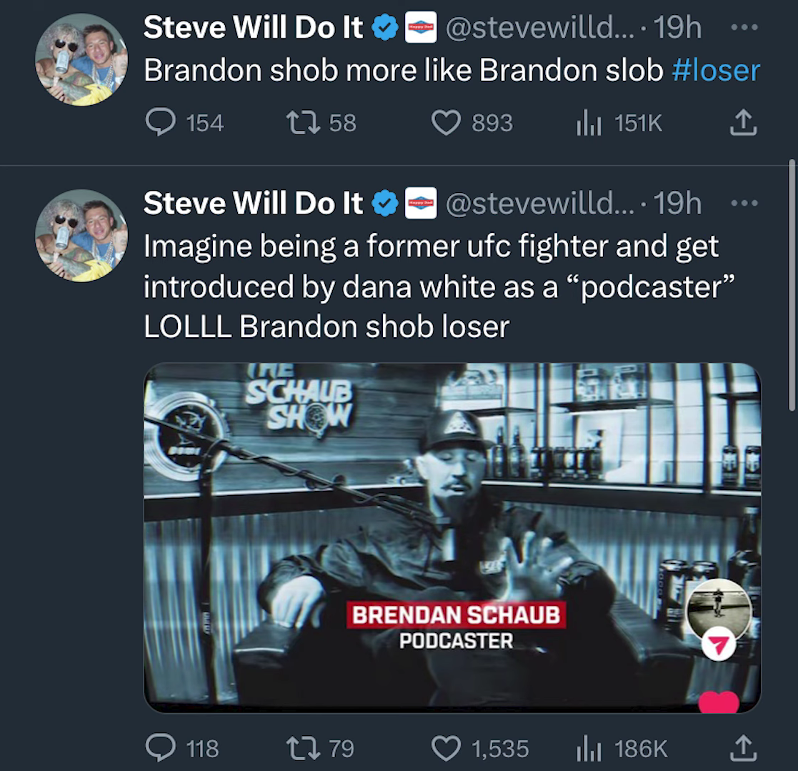 Social media influencer SteveWillDoIt has unleashed a public response to former UFC fighter Brendan Schaub after Schaub allegedly made claims about the YouTuber’s gambling debts and suggested improper behavior.