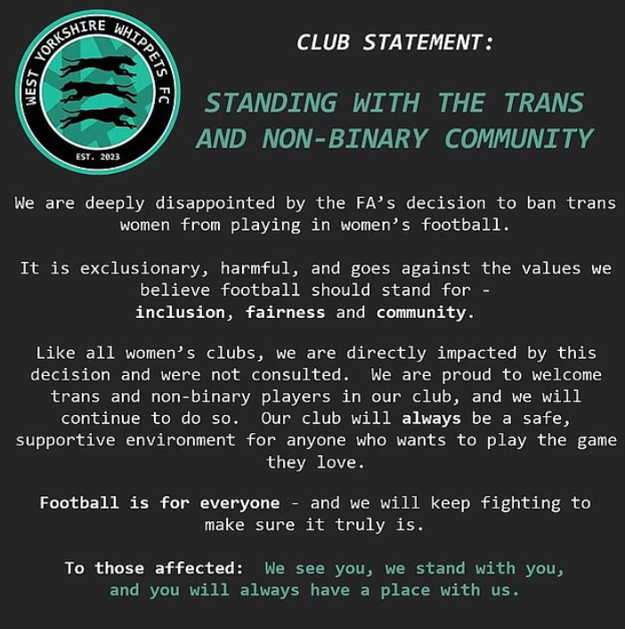 The West Yorkshire Whippets had joined other organizations in co-signing a letter calling for the FA to reverse its policy changes, emphasizing their belief that “football is for everyone.”