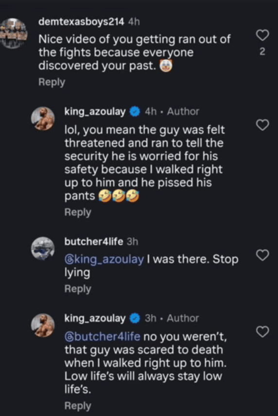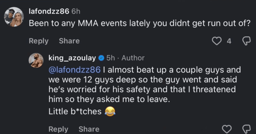 Azoulay dismissed the response outright. “No, you weren’t,” he wrote. “That guy was scared when I walked right up to him. Low lives always stay low lives.”