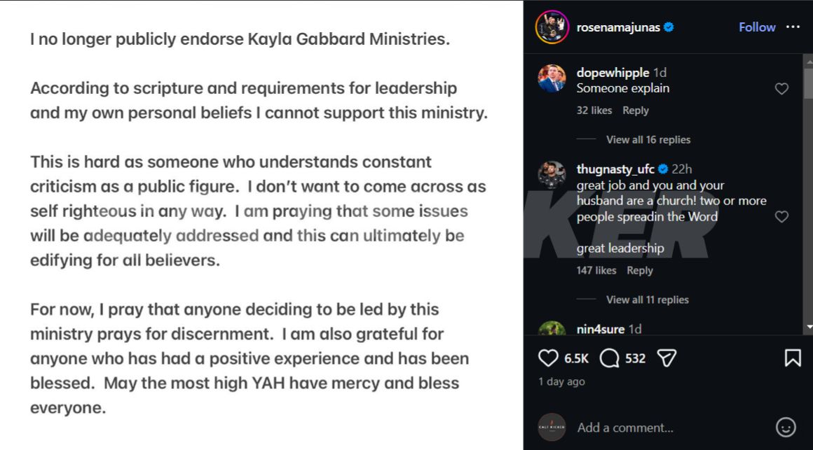 “I no longer publicly endorse Kayla Gabbard Ministries. According to scripture and requirements for leadership and my own personal beliefs I cannot support this ministry. This is hard as someone who understands constant criticism as a public figure. I don’t want to come across as self righteous in any way. I am praying that some issues will be adequately addressed and this can ultimately be edifying for all believers. For now, I pray that anyone deciding to be led by this ministry prays for discernment. I am also grateful for anyone who has had a positive experience and has been blessed. May the most high YAH have mercy and bless everyone.”